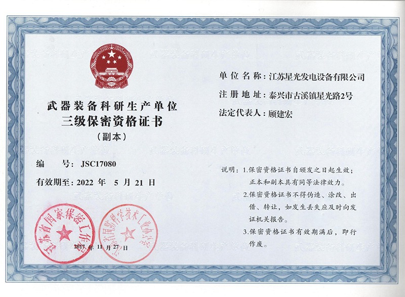 武器裝備科研生產(chǎn)單位三級(jí)保密證書(副本)